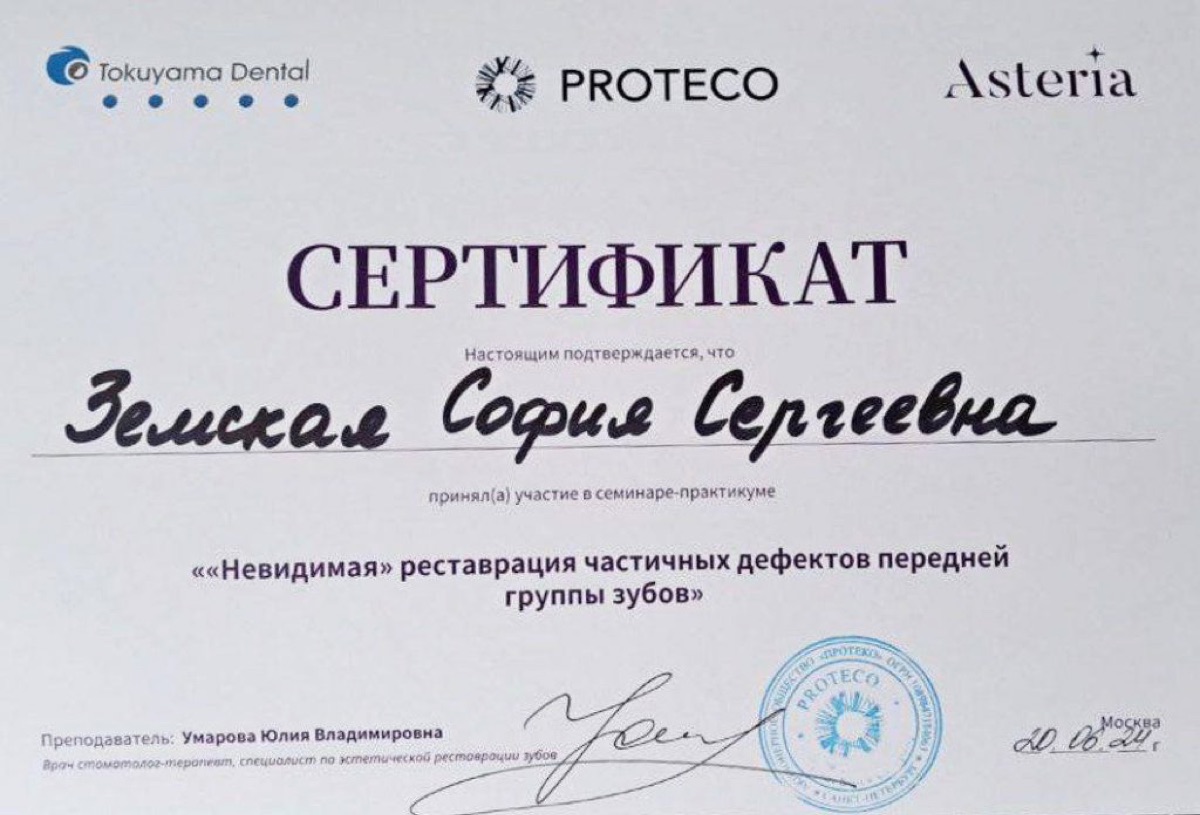 “София Сергеевна — настоящий профессионал своего дела. Восстановила дочке откол зуба с помощью художественной реставрации — результат идеальный, не отл...”