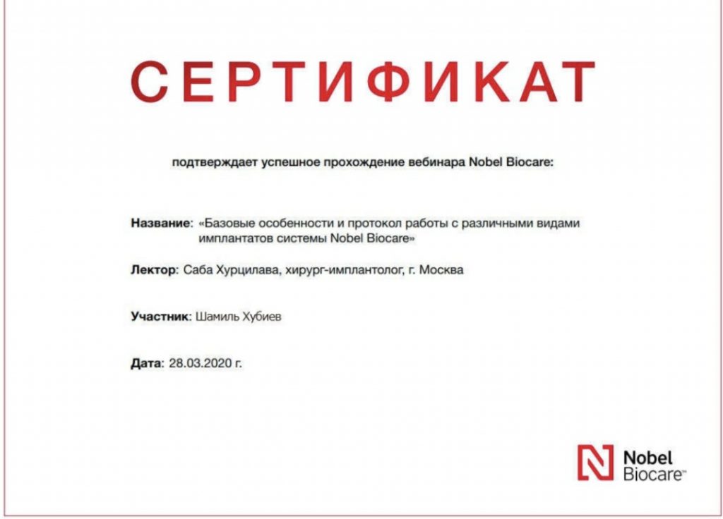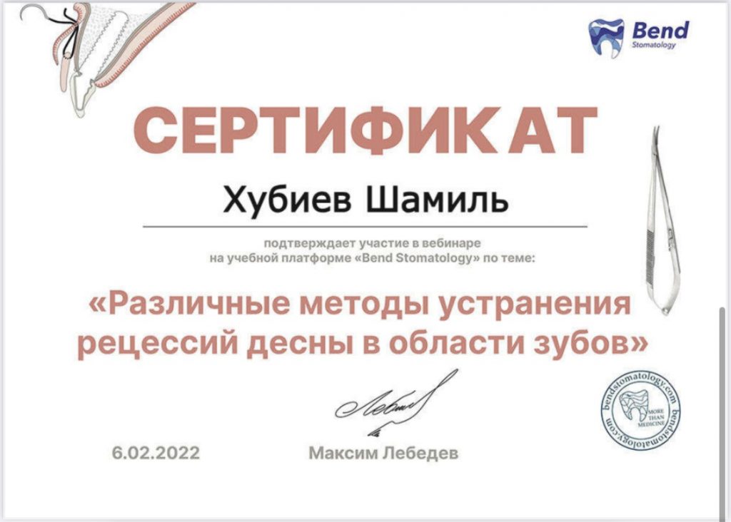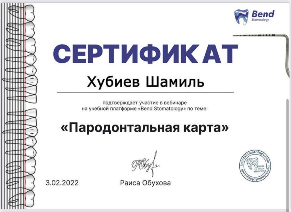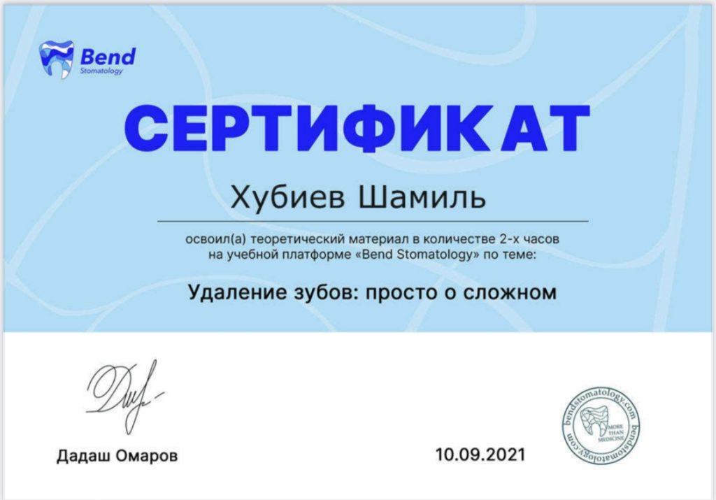2021 г.- свидетельство об аккредитации специалиста, ФГБОУ ВО «Ставропольский государственный медицинский университет» Министерства здравоохранения РФ г. Ставрополь, первичная аккредитация, врач стоматолог общей практики