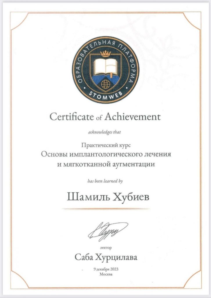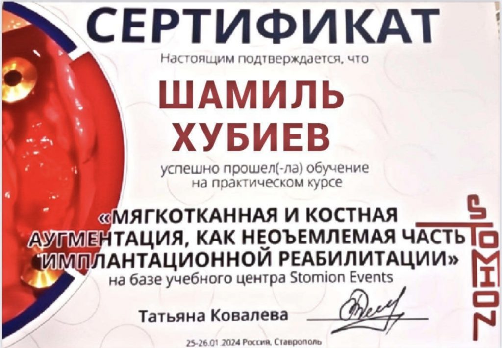 2023 г.- рег номер 49, ФГБОУ ВО «Ставропольский государственный медицинский университет» Министерства здравоохранения РФ г.Ставрополь, диплом об окончании ординатуры, врач стоматолог хирург